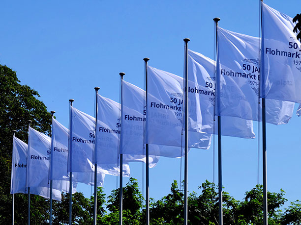Die offizielle Beflaggung zum Flohmi-Jubiläum wird installiert (nun braucht's nur noch schöneres Wetter ...) – so wie hier, in der Woche nach der Jubiläumsfeier: